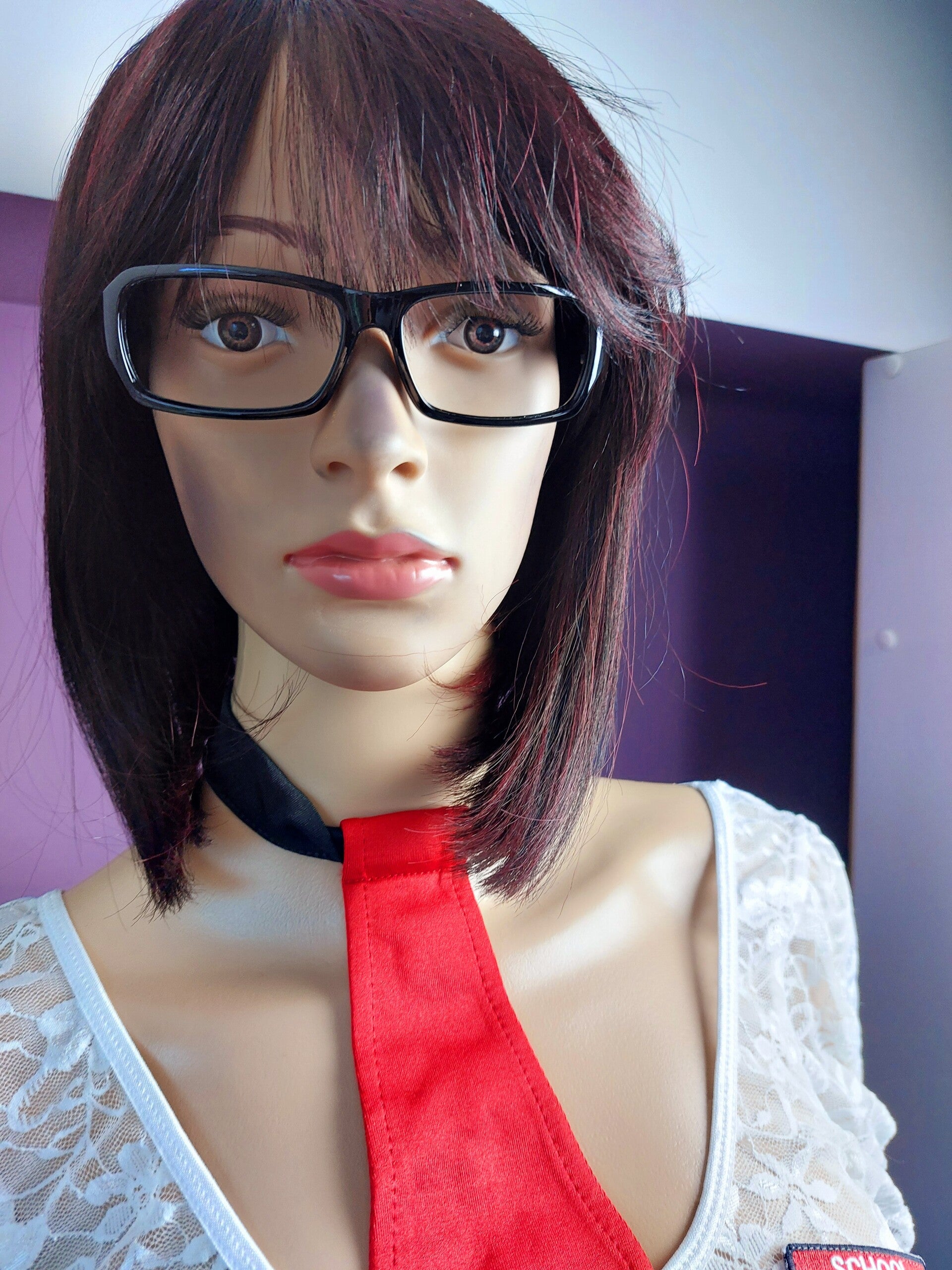 Cravate rouge et noire façon écolière et une paire de lunettes incluse, pour un look professeur irrésistible.
