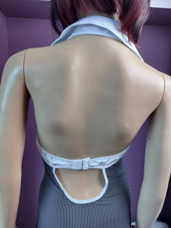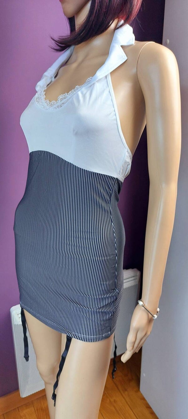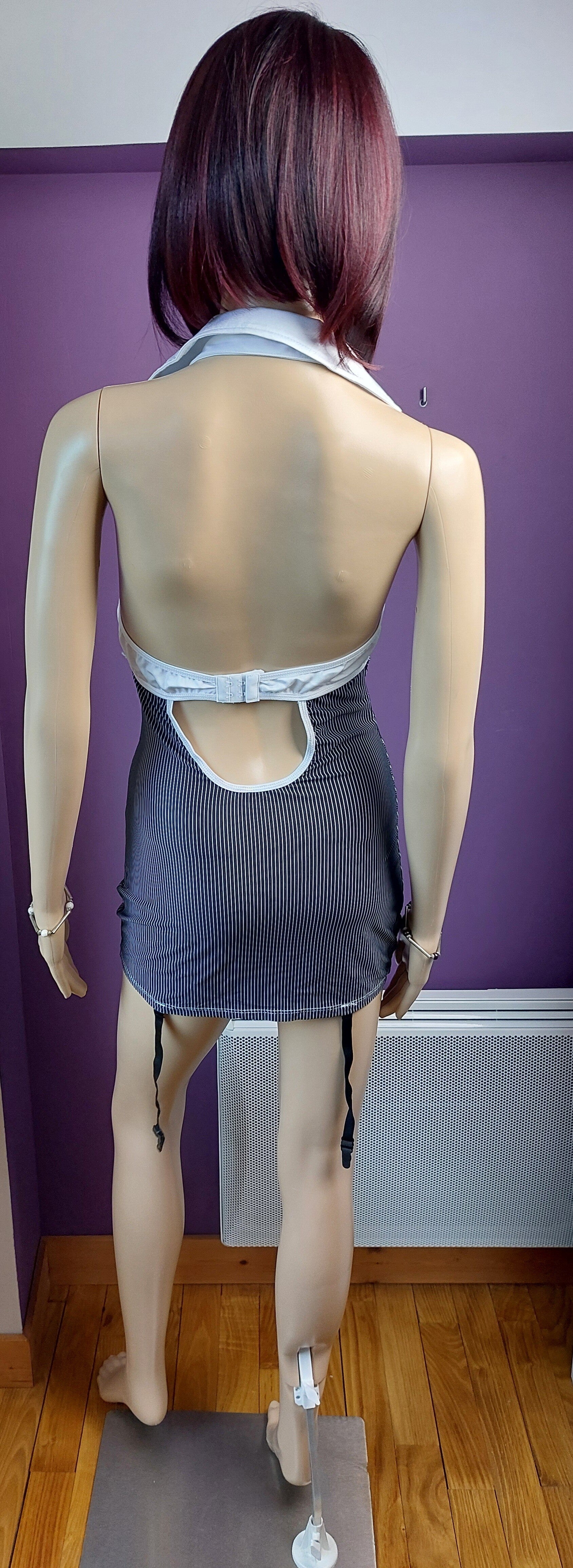 Dos totalement ouvert avec attache type soutien-gorge pour un effet ultra sexy Jarretelles intégrées pour un look secrétaire glamour jusqu’au bout, bas et bas résille noir inclus dans la boîte.