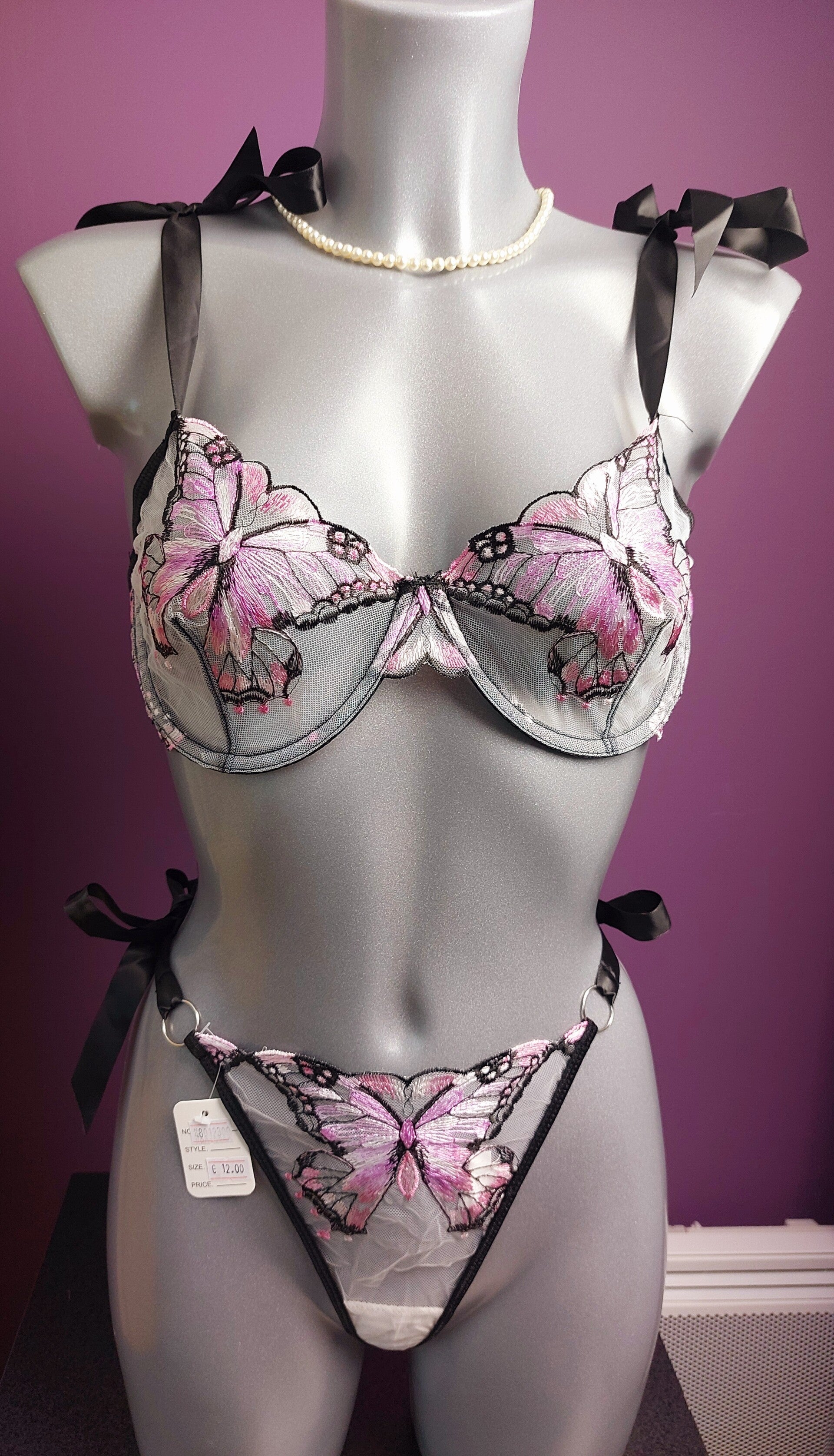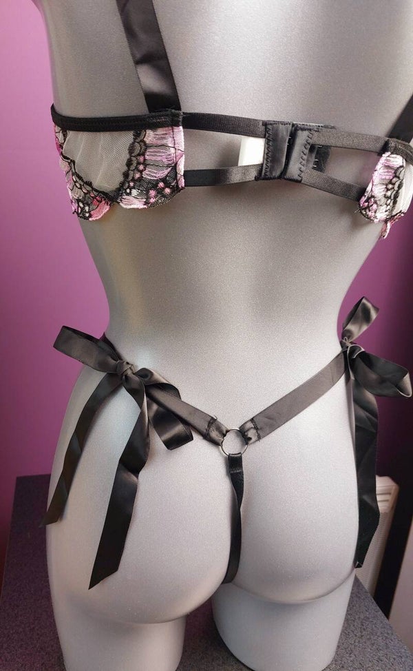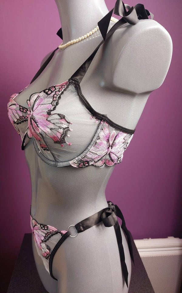 Craquez pour ce magnifique ensemble lingerie 2 pièces au style romantique et féminin, sublimé par de délicats papillons brodés dans des tons rose poudré et noir.