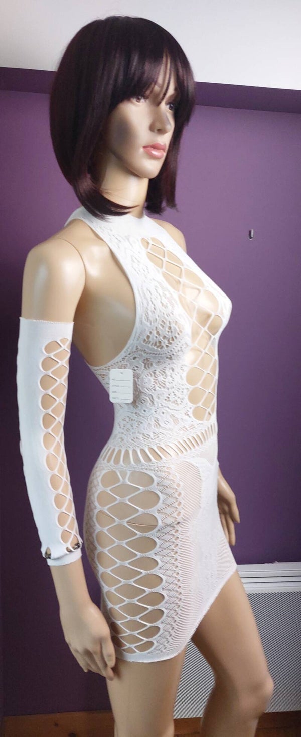 Sublime robe courte en résille blanche, au style à la fois sexy, chic et audacieux, accompagnée de ses mitaines assorties pour un look ultra tendance.