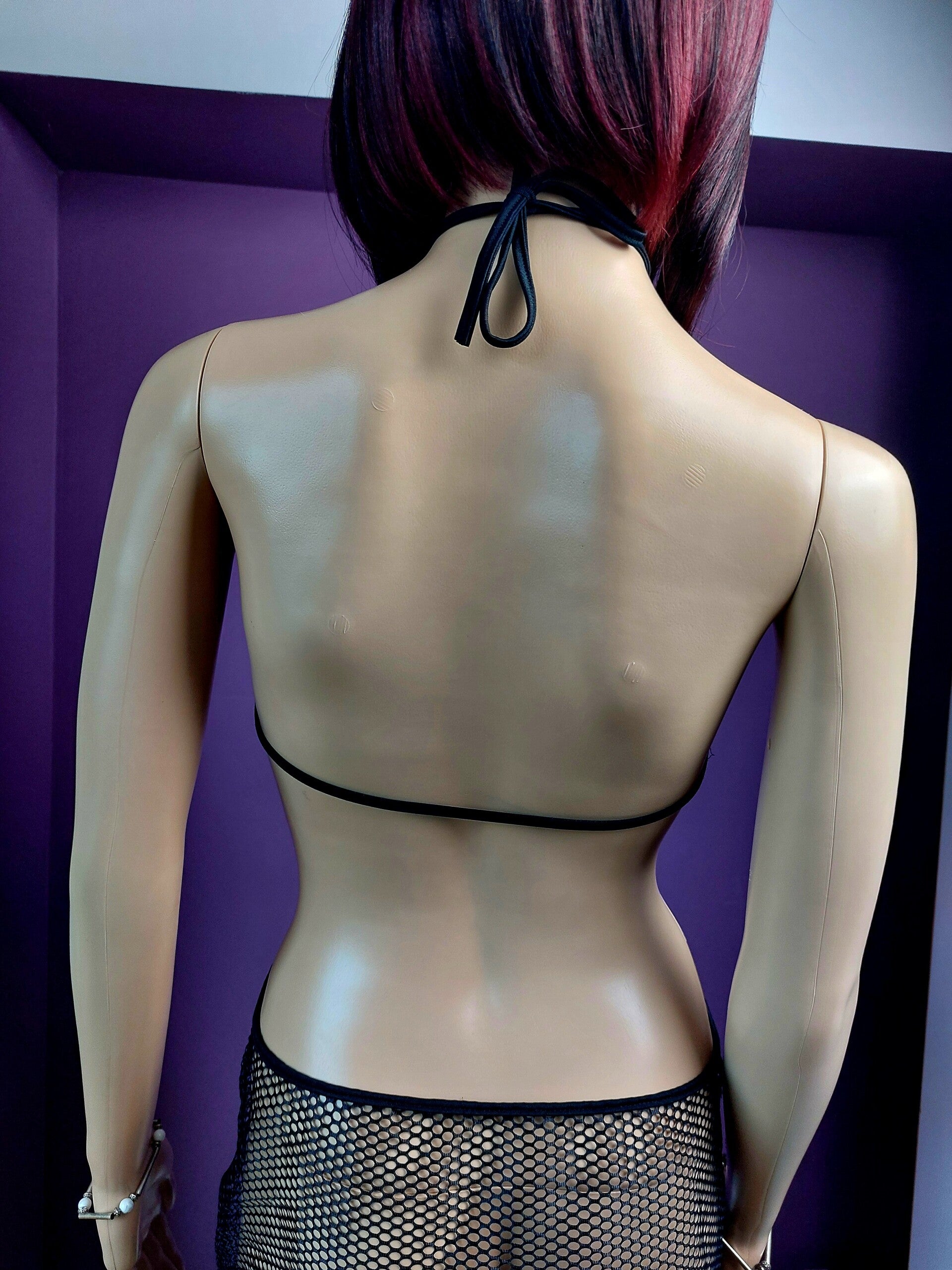 Matière en maille filet extensible, légère et agréable à porter, décolleté avec tour de cou et anneau métallique à l’avant.