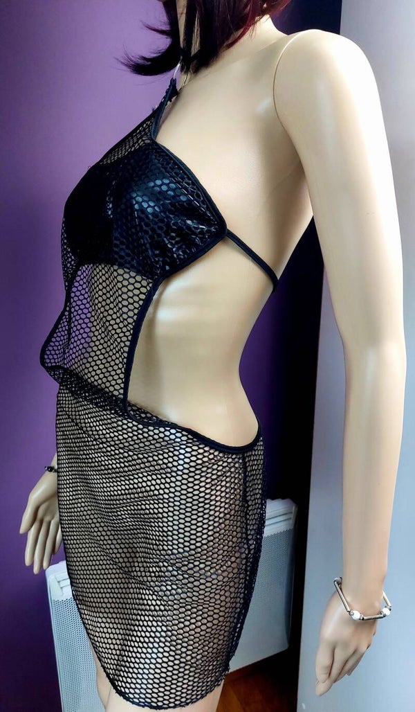 Sublime robe en maille filet noire, au style audacieux et ultra féminin.