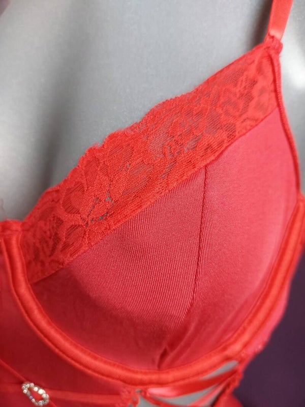 Mettez en valeur votre silhouette avec ce body rouge ultra féminin, délicatement orné de dentelle et de rubans satinés et de jolis petits cœurs en strass.