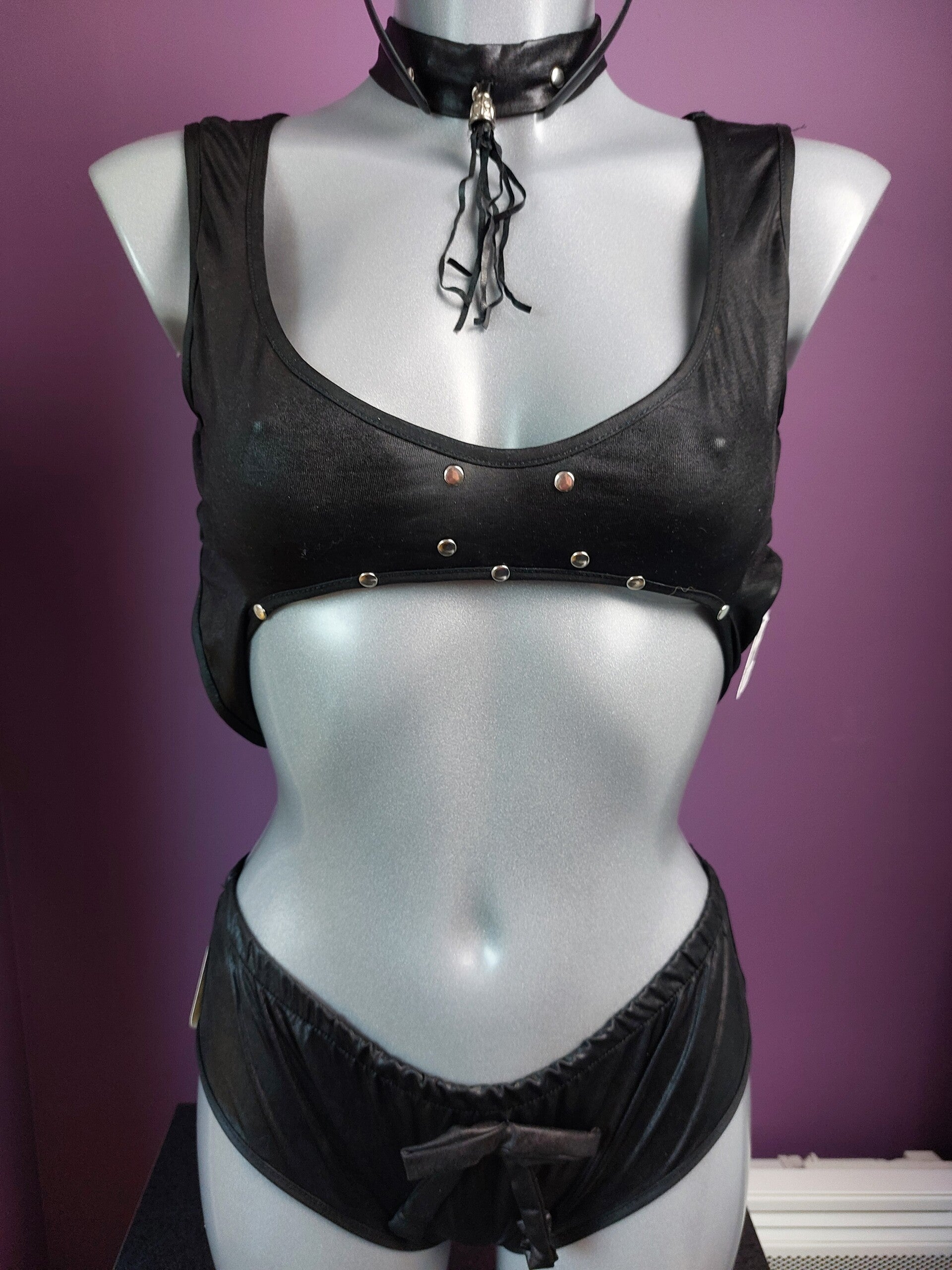 Ensemble 5 pièces assorties, noir brillant à l’effet simili cuir, conçu pour sublimer la silhouette.
