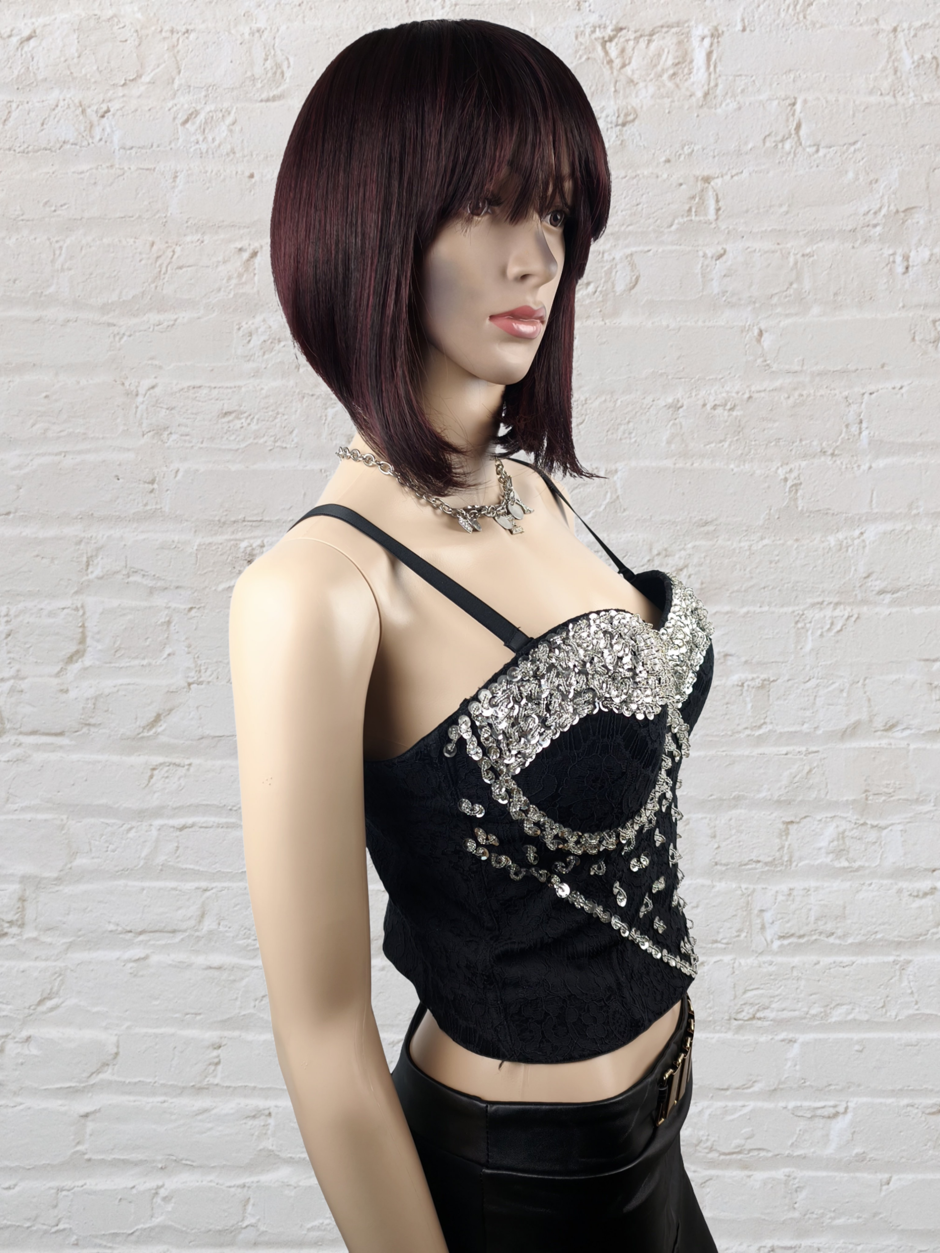 Superbe bustier noir au style glamour et élégant, entièrement sublimé par de magnifiques sequins argentés cousus avec soin sur la poitrine et le devant.