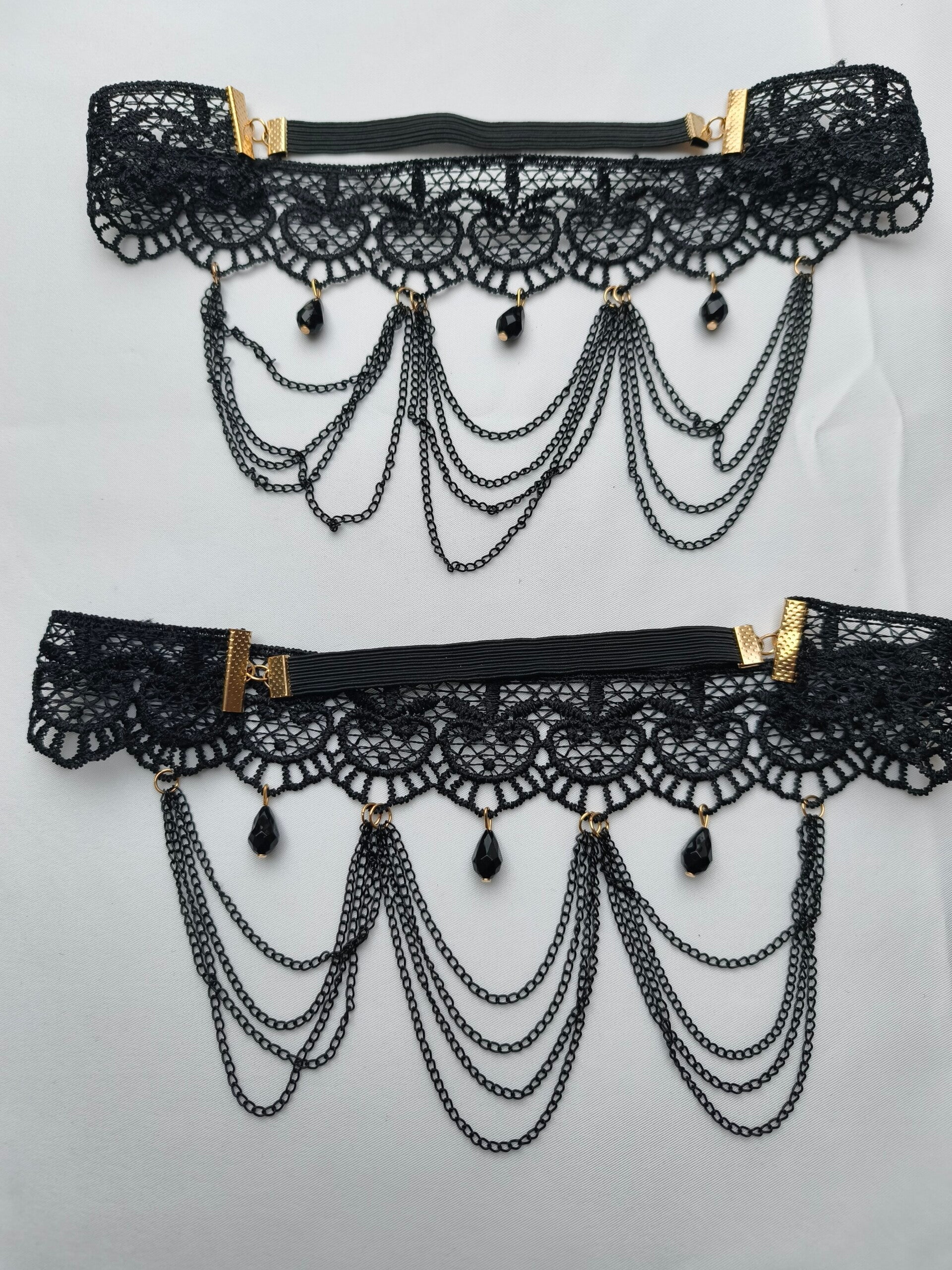 Confectionné en dentelle noire, orné de chaînes fines drapées et de perles noires pendantes qui apportent une touche élégante et sophistiquée.