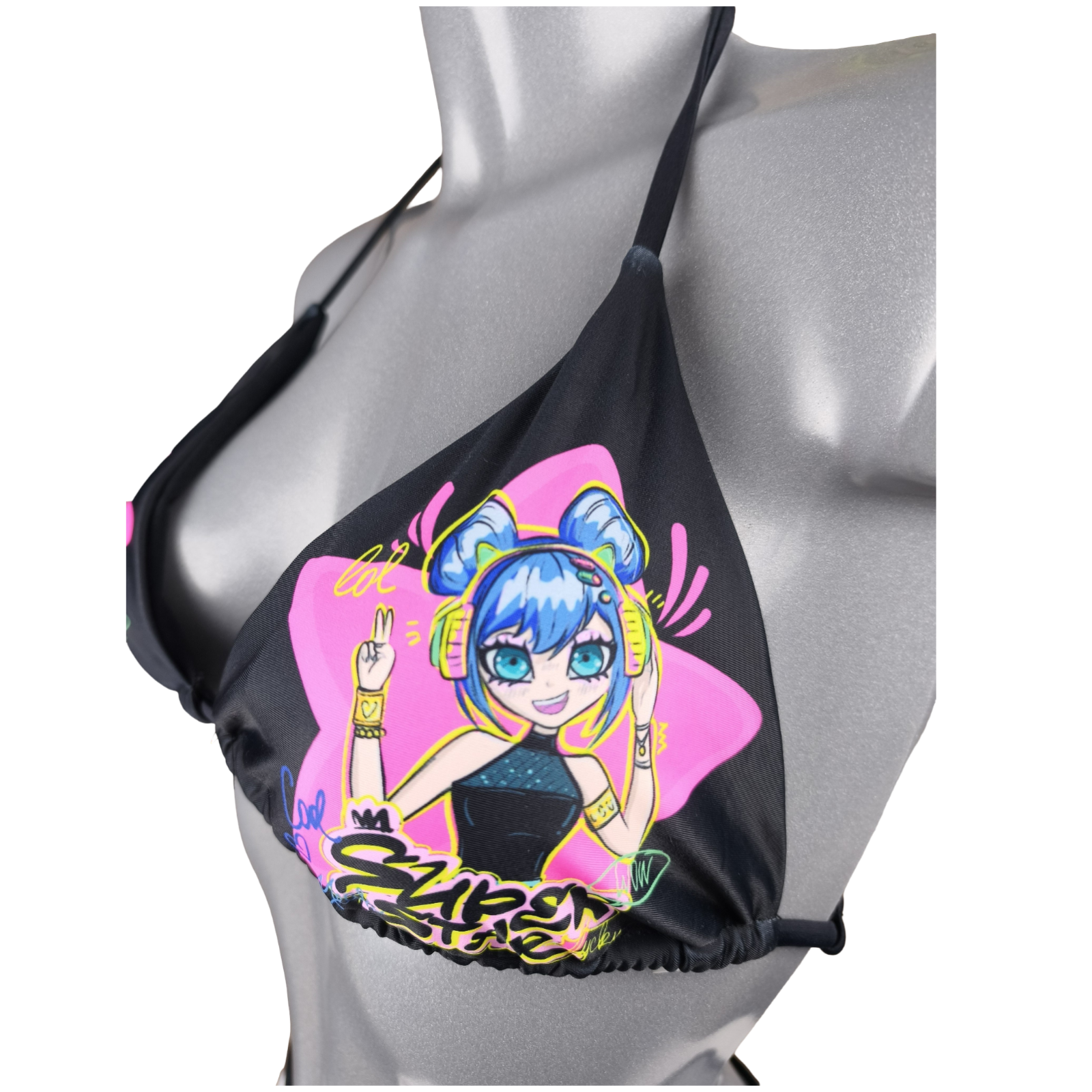 Joli maillot de bain deux pièces noir, moderne et original, avec haut triangle décoré d’un imprimé graphique coloré façon pop/BD qui apporte une touche fun et stylée.