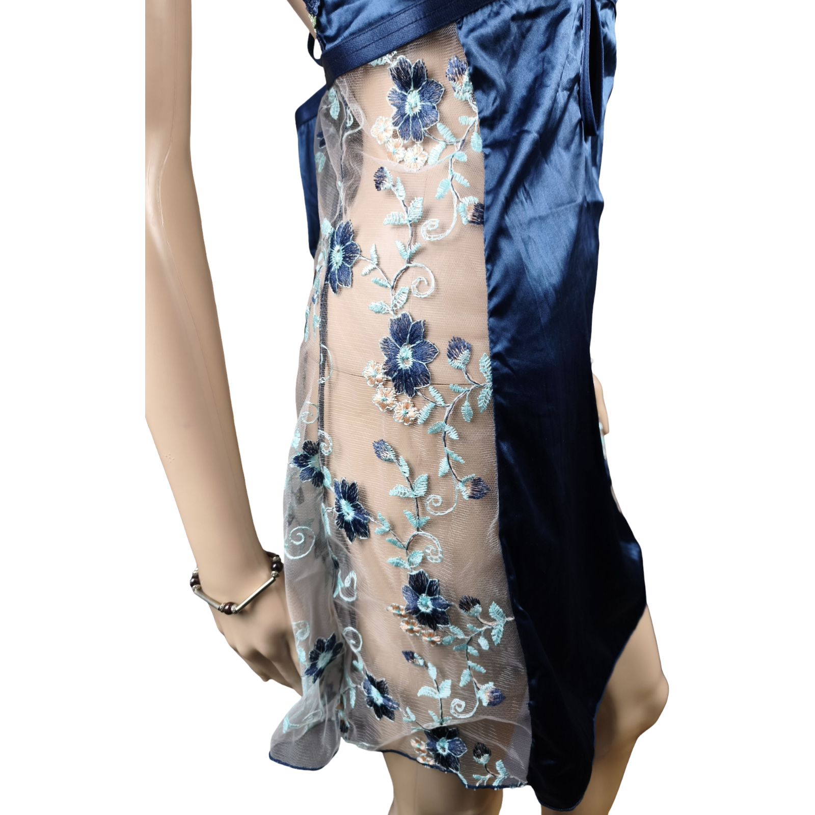 Joli décolleté plongeant avec bretelles fines décorées de petites fleurs, empiècements en tulle transparent brodé fleurs bleues, très élégants sur les côtés.