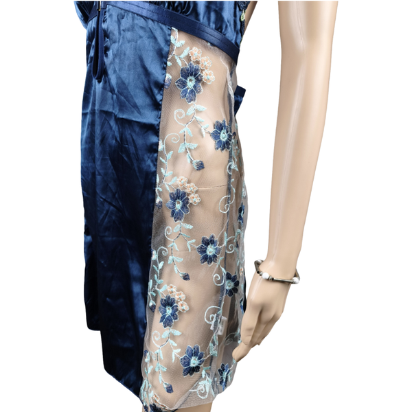 Sublime nuisette bleu nuit en satin brillant avec empiècements en tulle brodé floral, parfaite pour un look à la fois glamour, délicat et raffiné.