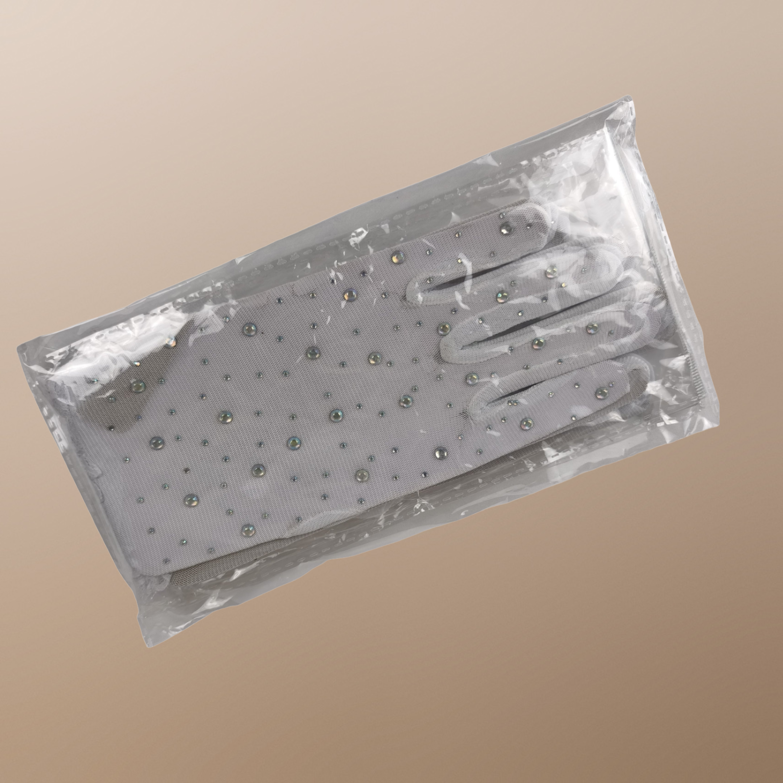 Le tissu blanc légèrement extensible épouse joliment la main, tandis que les strass délicatement répartis captent la lumière pour un effet brillant subtil et raffiné.