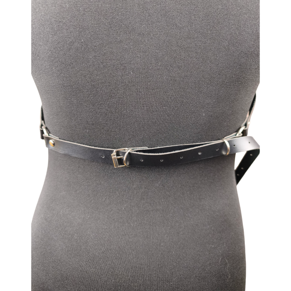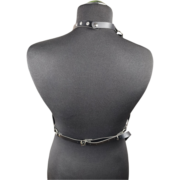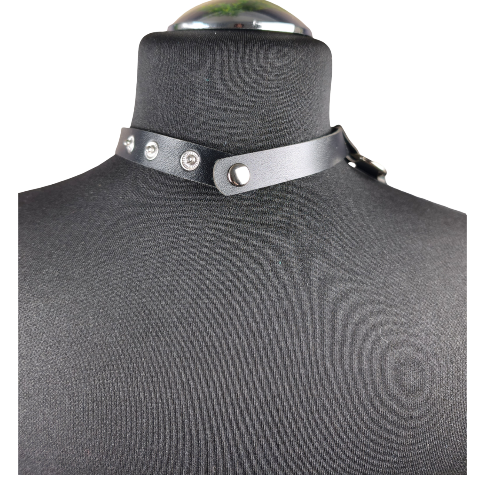 Ce harnais est composé d'un tour de cou type choker avec anneau central, bretelles en simili cuir noir et anneaux métalliques décoratifs.