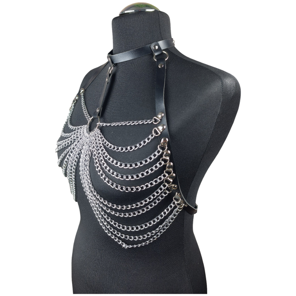 Sublime harnais bijou en simili cuir noir avec multiples chaînes argentées, taille unique réglable.