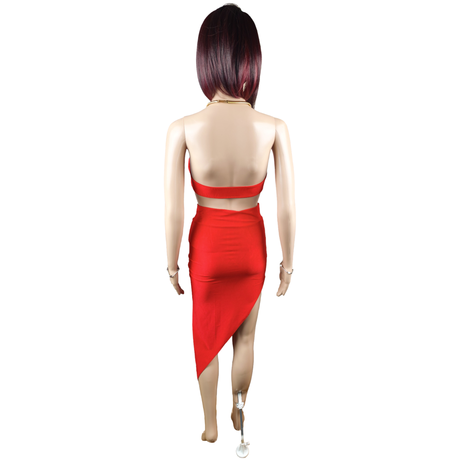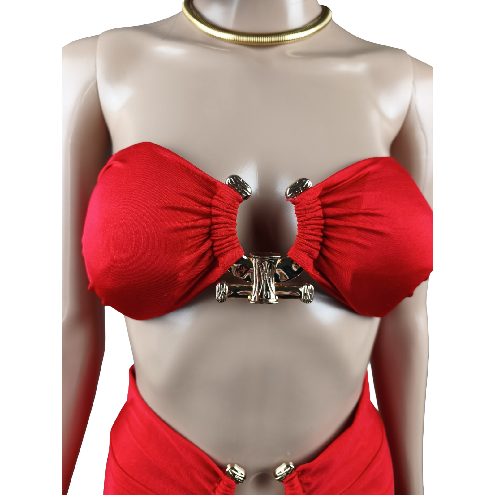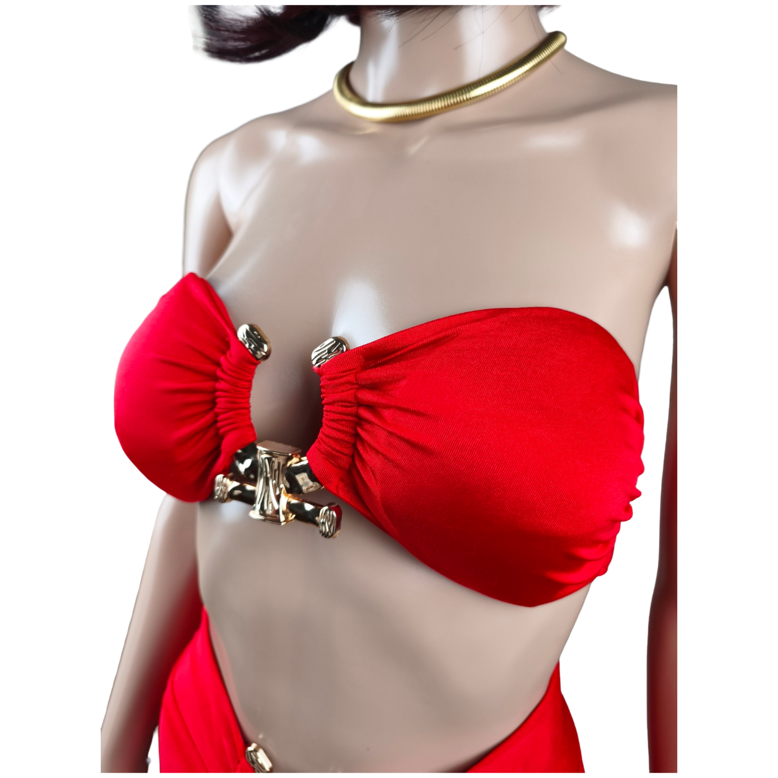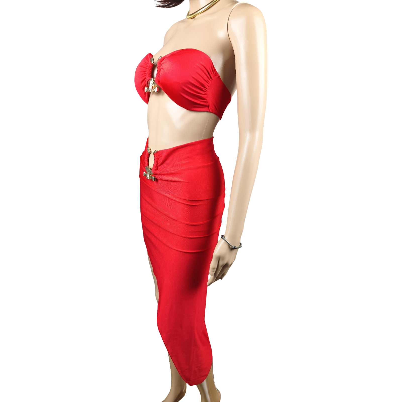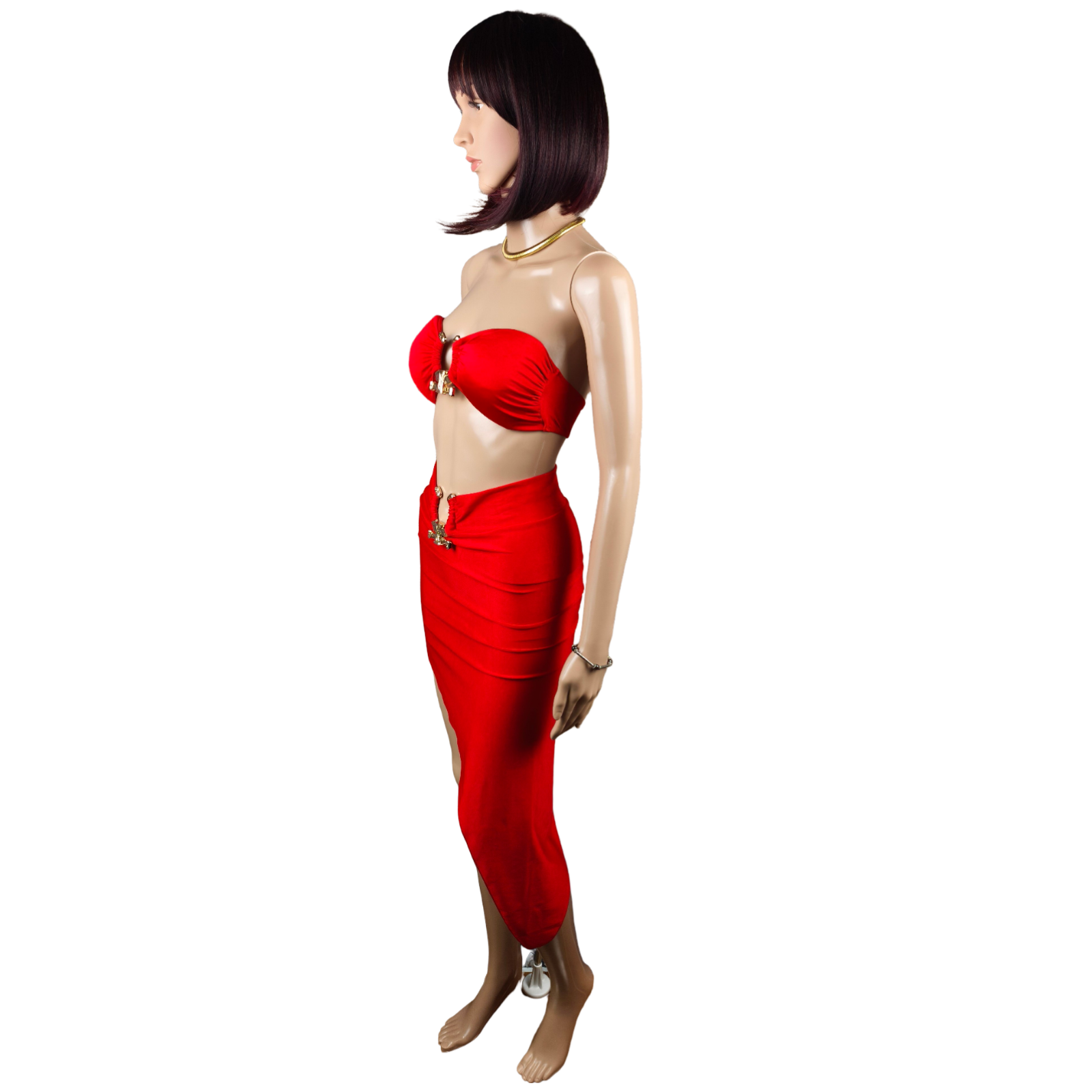 Magnifique ensemble 2 pièces rouge intense composé d’un top bandeau et d’une jupe asymétrique, parfait pour un look sexy, chic et ultra tendance.