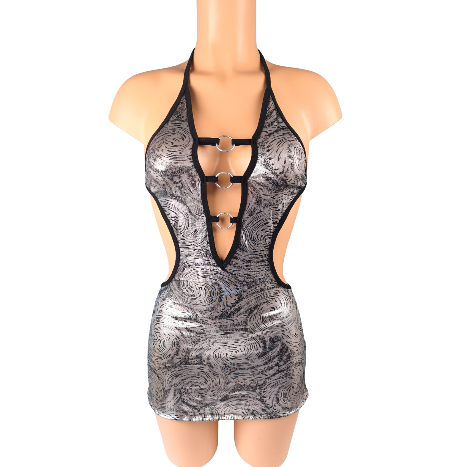 Robe métallisée dos nu & décolleté anneaux métalliques – Taille unique (S à L)