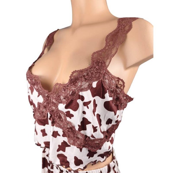 Parfait pour rester stylée même à la maison tout en étant à l’aise. Imprimé vache original et très tendance, jolis détails en dentelle élégants et féminins.