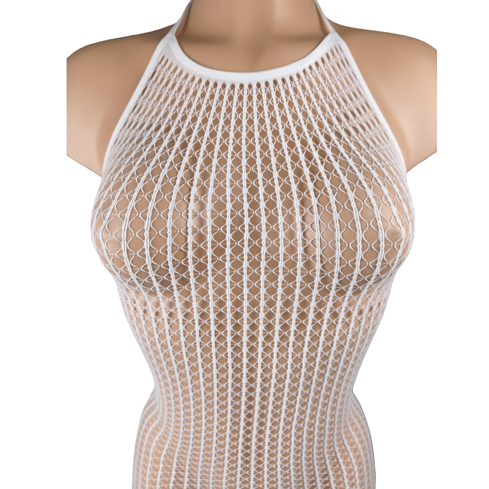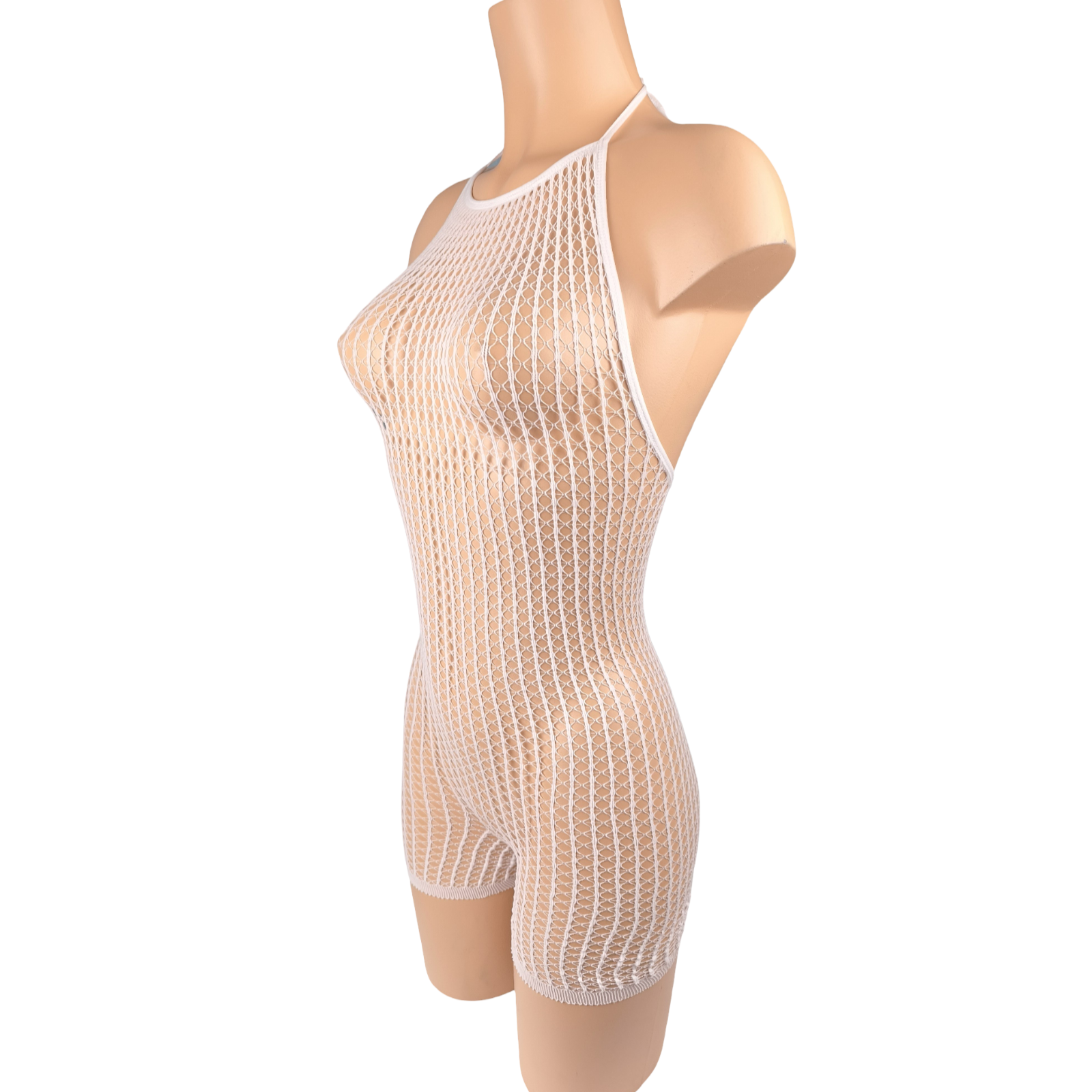 Elégant combishort en résille blanche, au style sexy, minimaliste et ultra tendance.