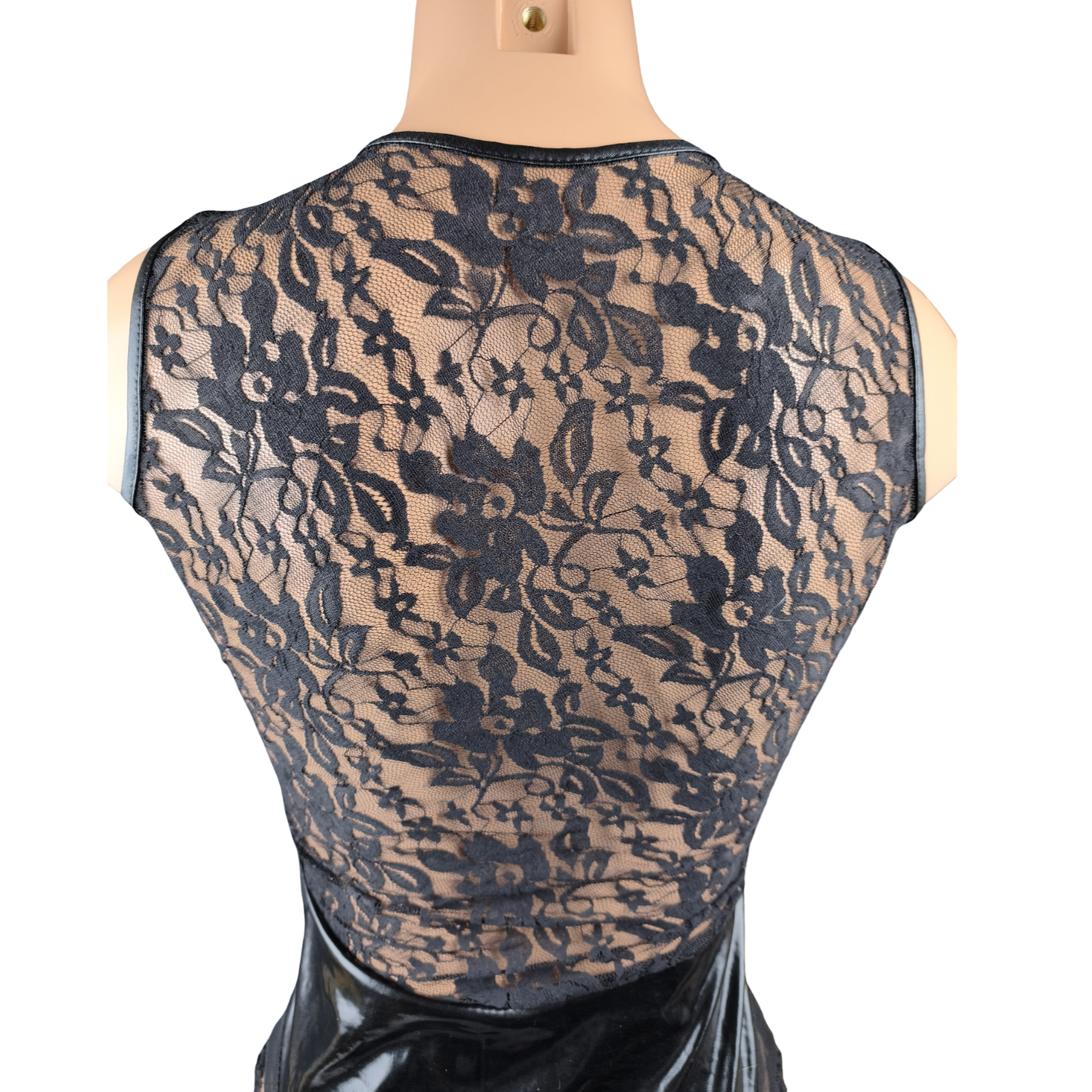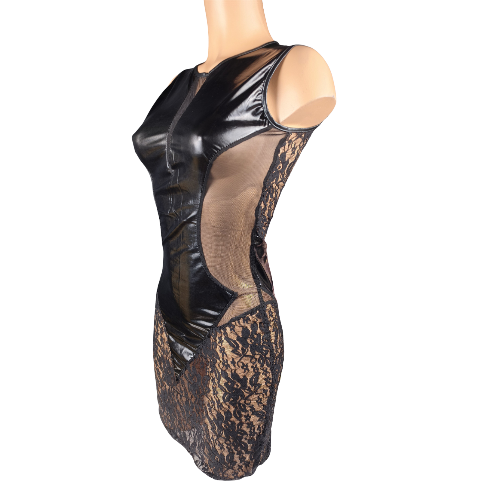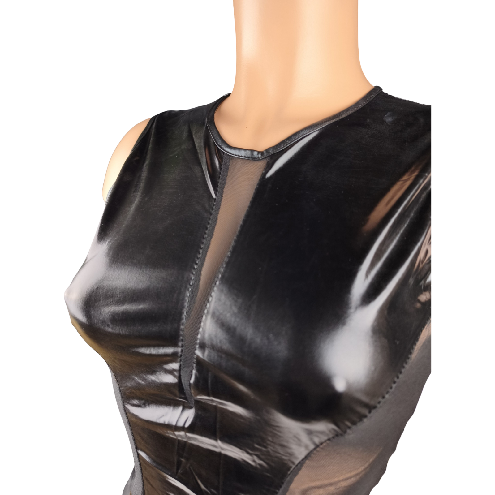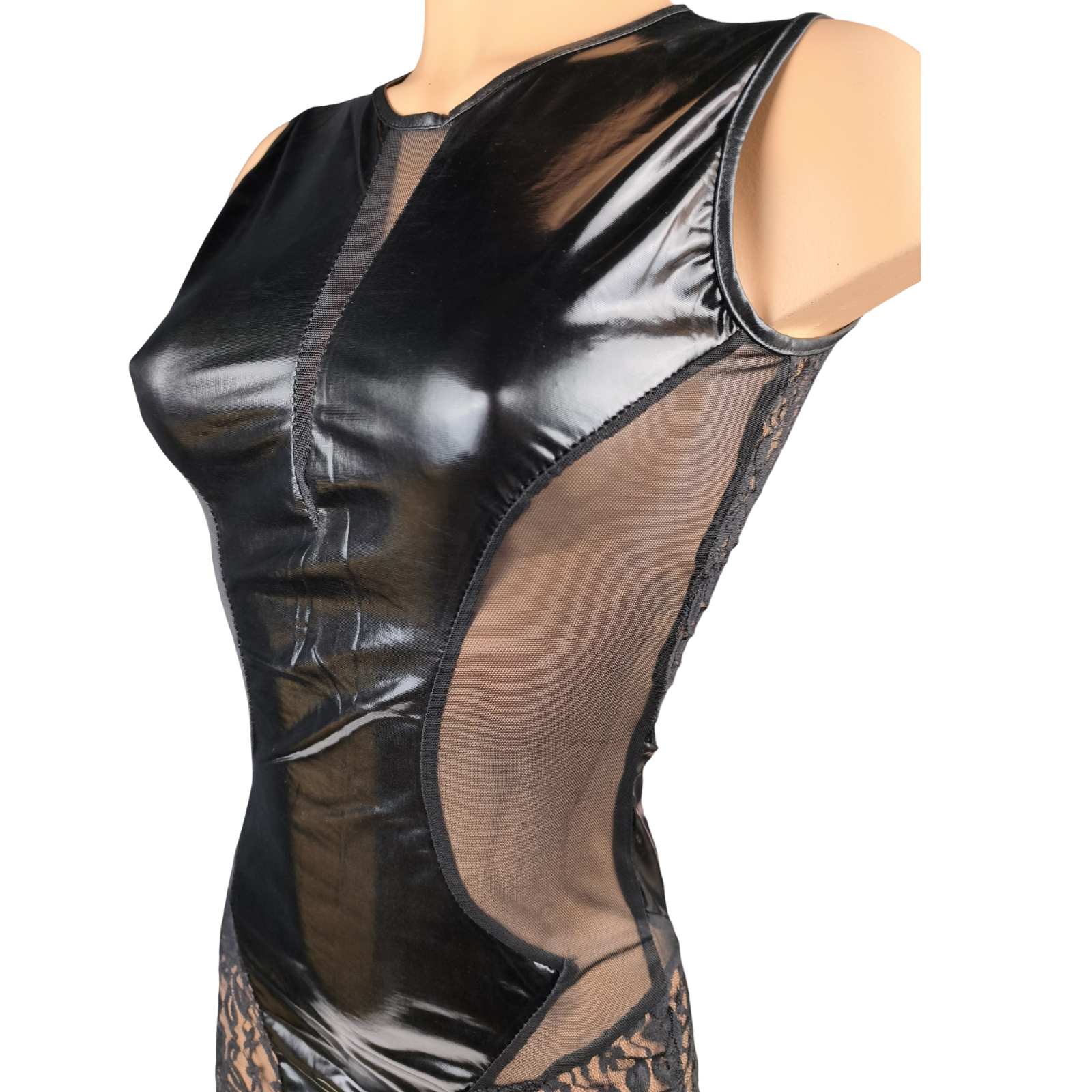 Coupe ajustée, effet seconde peau. Partie centrale en tissu effet wetlook noir (aspect brillant, très tendance), empiècements en dentelle et mesh transparents sur les côtés et le bas.