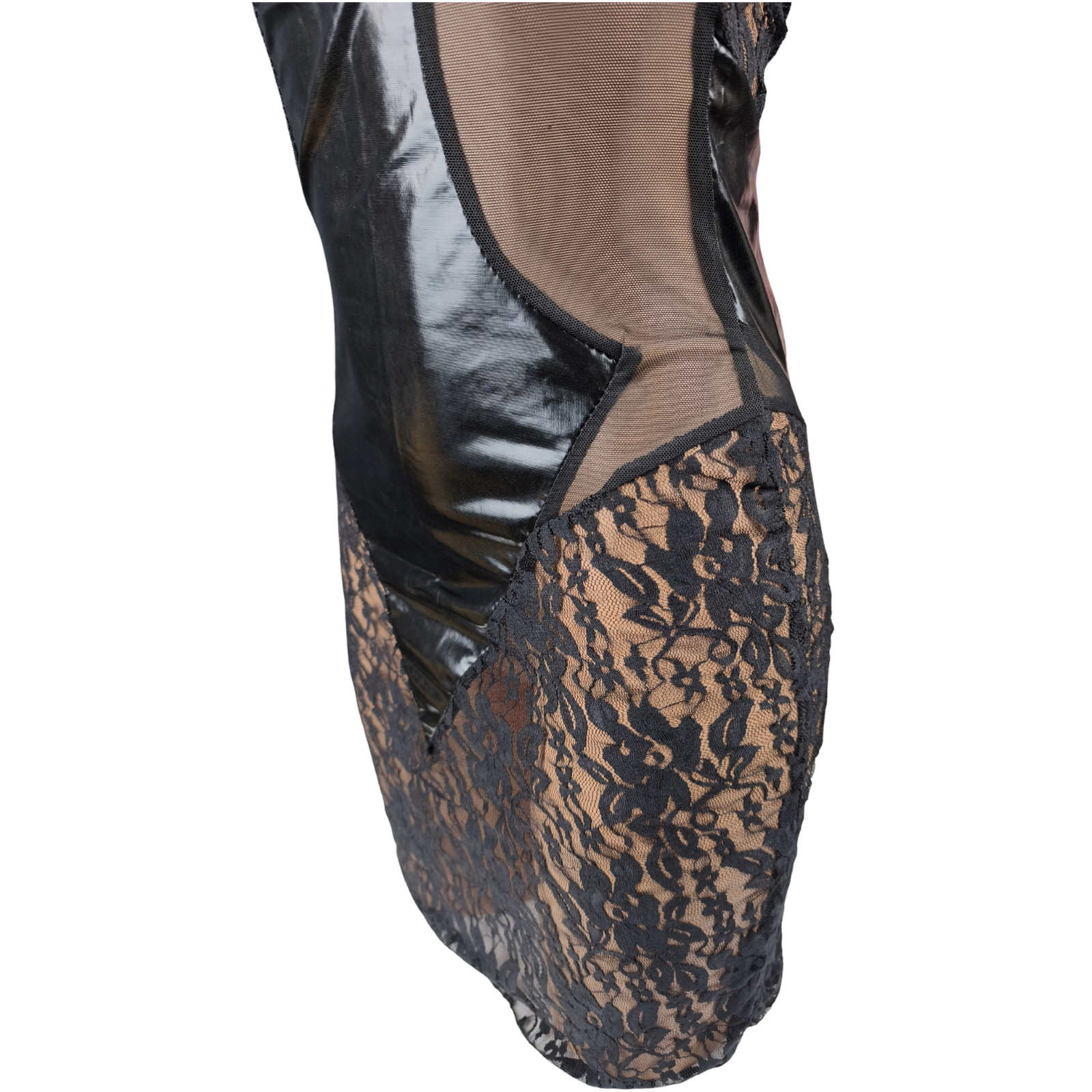 Un mélange parfait entre effet vinyle brillant (wetlook) et dentelle délicate, pour une allure à la fois audacieuse et élégante.